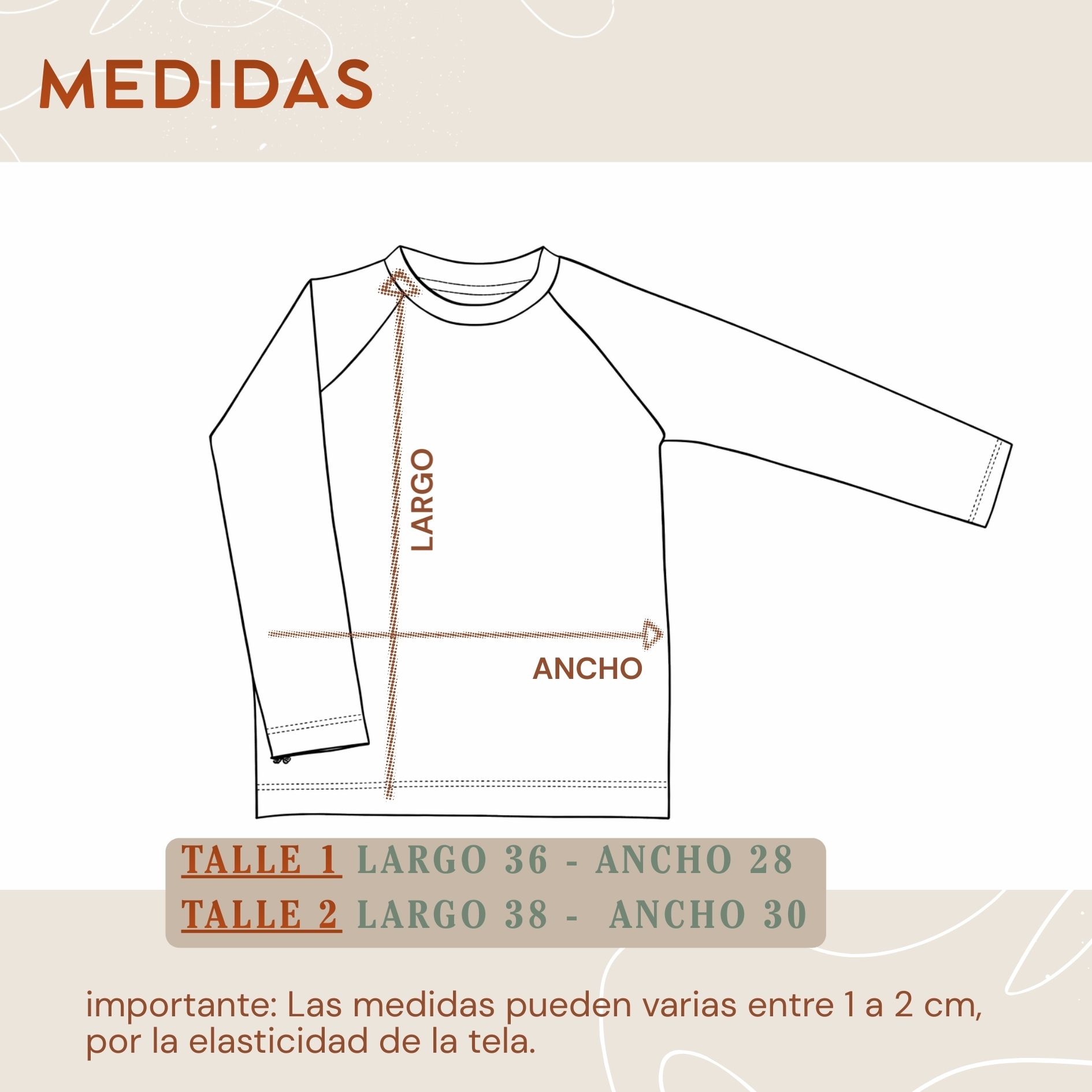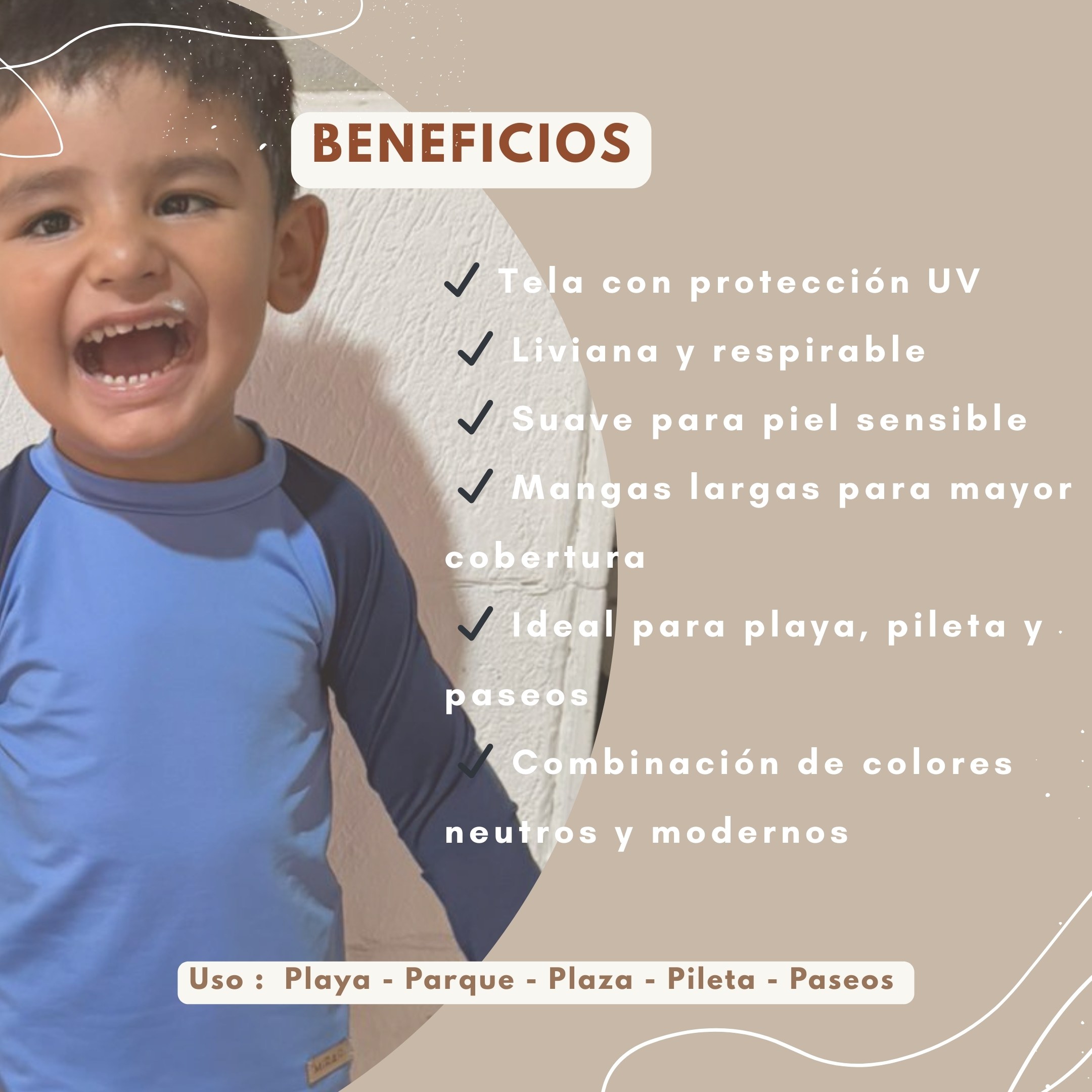 Su diseño de mangas largas permite cubrir mayor superficie del cuerpo, brindando seguridad, confort y libertad de movimiento durante paseos, playa, pileta o actividades al aire libre.