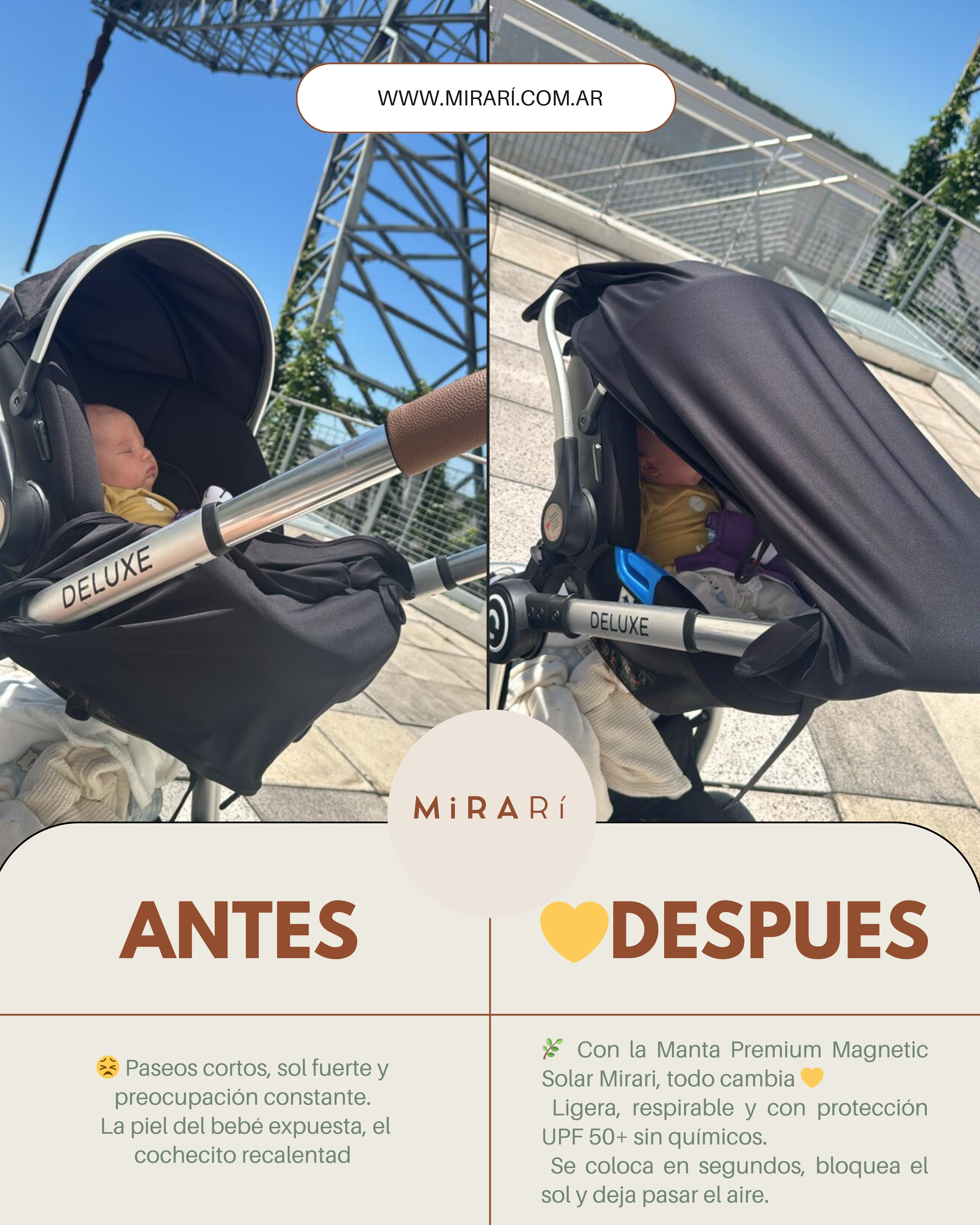 La tela UV 50+ bloquea los rayos solares. Aun así, recomendamos evitar sol directo intenso y complementar con gorrito/protector en mayores de 6 meses según pediatra.